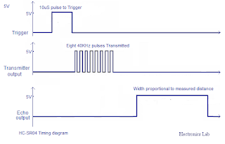 From the timing diagram, you can see that the 40KHz pulse train is transmitted just after the 10uS triggering pulse and the echo output is obtained after some more time. The next triggering pulse can be given only after the echo is faded away and this time period is called cycle period. The cycle period for HC-SR04 must not be below 50mS. According to datasheet, the distance can be calculated from the echo pulse width using the following equations.